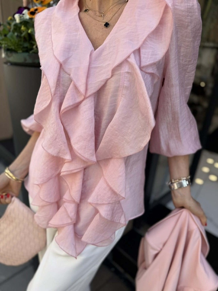 Риза от ефирна материя с волани в предната част. Моделът е със свободна кройка и няма закопчаване.