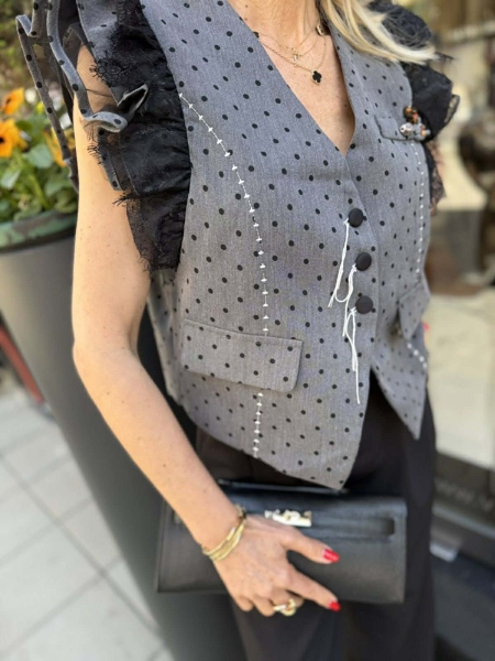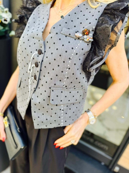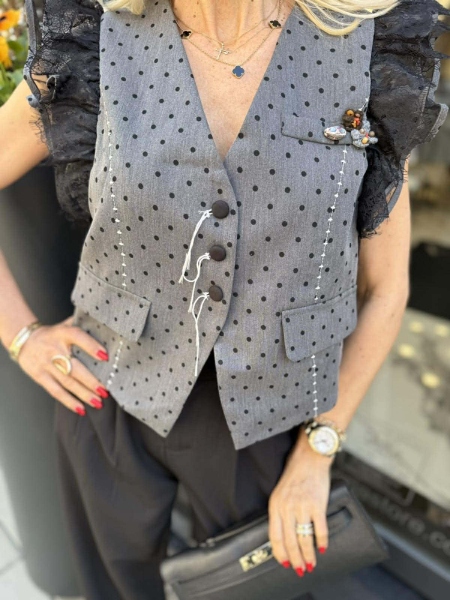 Елек в сив цвят на точки с декорация на раменете. Моделът е със свободна кройка.