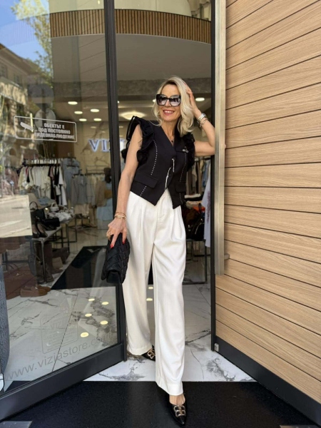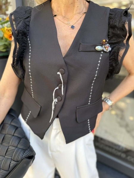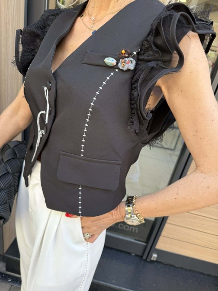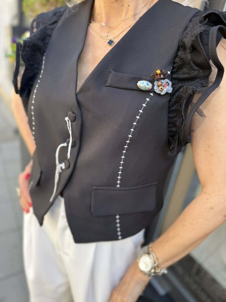 Елек в черно с декорация на раменете. Моделът е със свободна кройка.