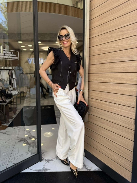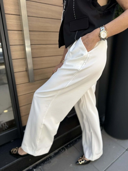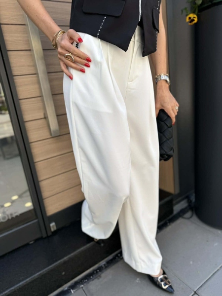 Панталон с широки крачоли и басти. Моделът се закопчава с цип и копче и има странични джобове.