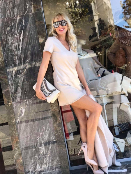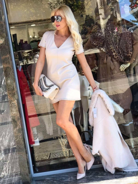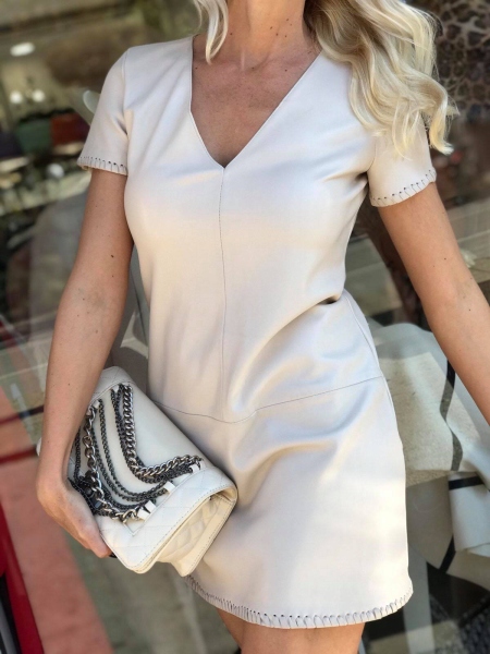 Кожена роля в бежов цвят със свободен силует.Дължината на роклята е над коляното.Модела е без закопчаване.
